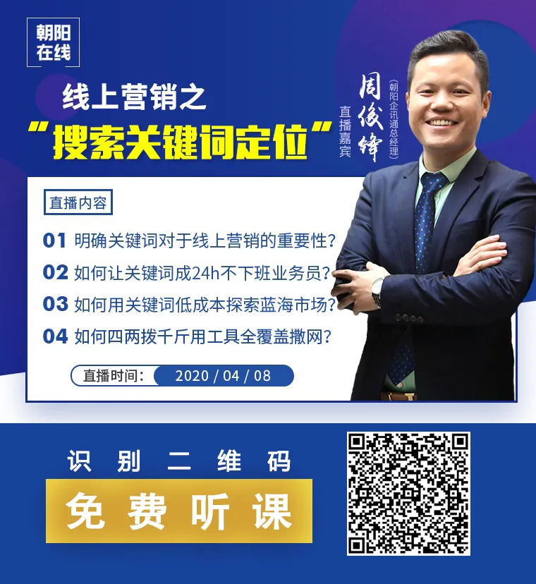 朝陽在線全面啟動免費線上營銷課程直播,這些課程幫助大部分企業解決“線上營銷、盈利模式、如何布局遇到的問題。不僅適合互聯網運營、創業者們,更適合個人及商家學習。