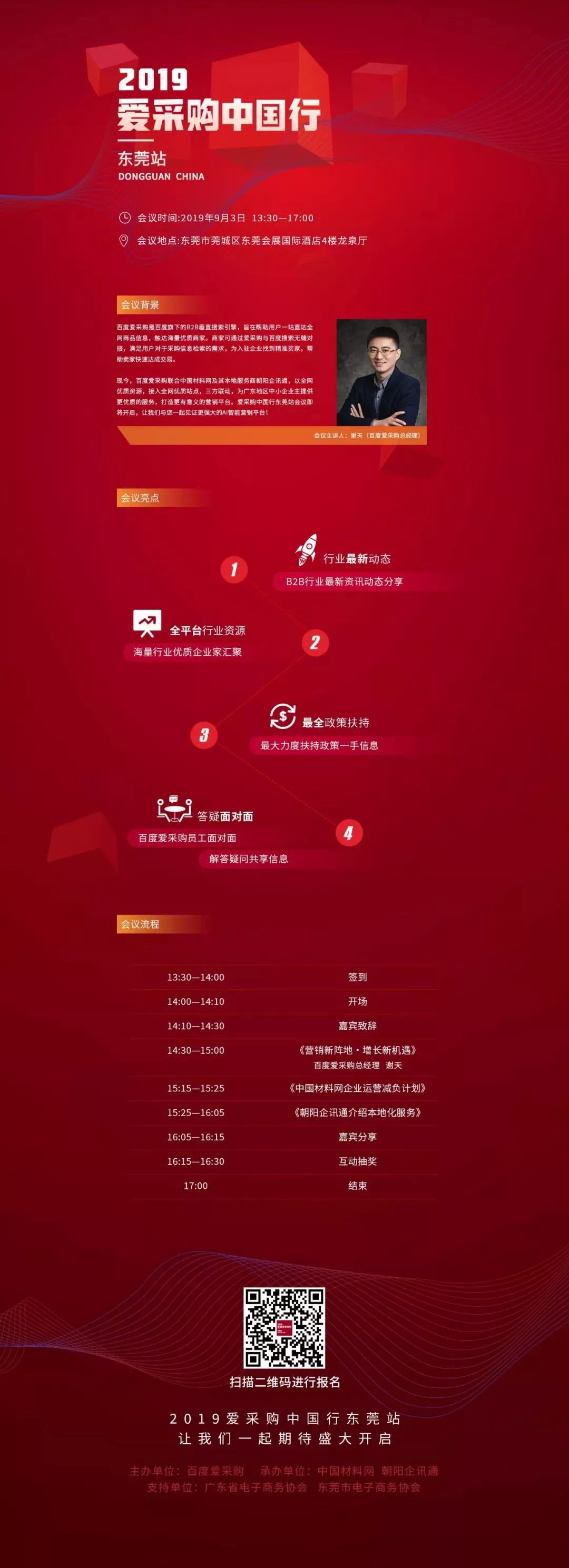 9月3日,百度愛采購將聯合朝陽企訊通、中國材料網,在東莞會展國際酒店舉辦行業峰會,屆時將由百度愛采購總經理謝天給大家分享新的機遇,還有幸邀請廣東商會和東莞商會、中國材料網和朝陽企訊通的主要負責人到場。